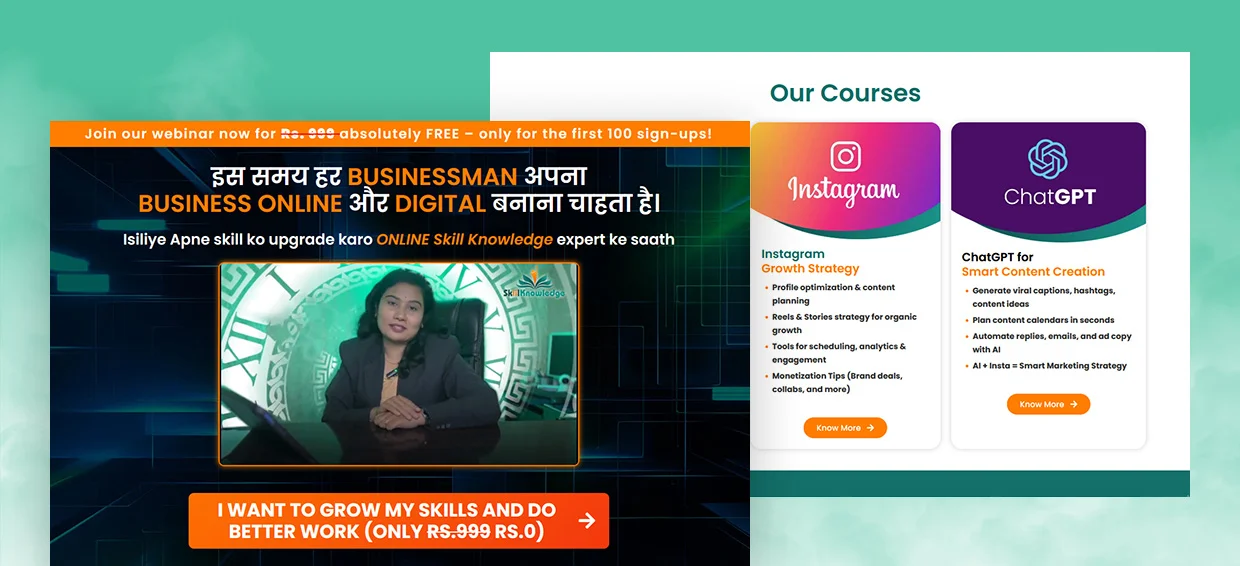 SkiilKnowledge stands out by combining digital services with skill-based training — addressing the needs of small business owners who want online growth and students/freelancers who want to earn via digital skills. The clean, well-structured landing page effectively serves both audiences, builds trust, and drives meaningful conversions.